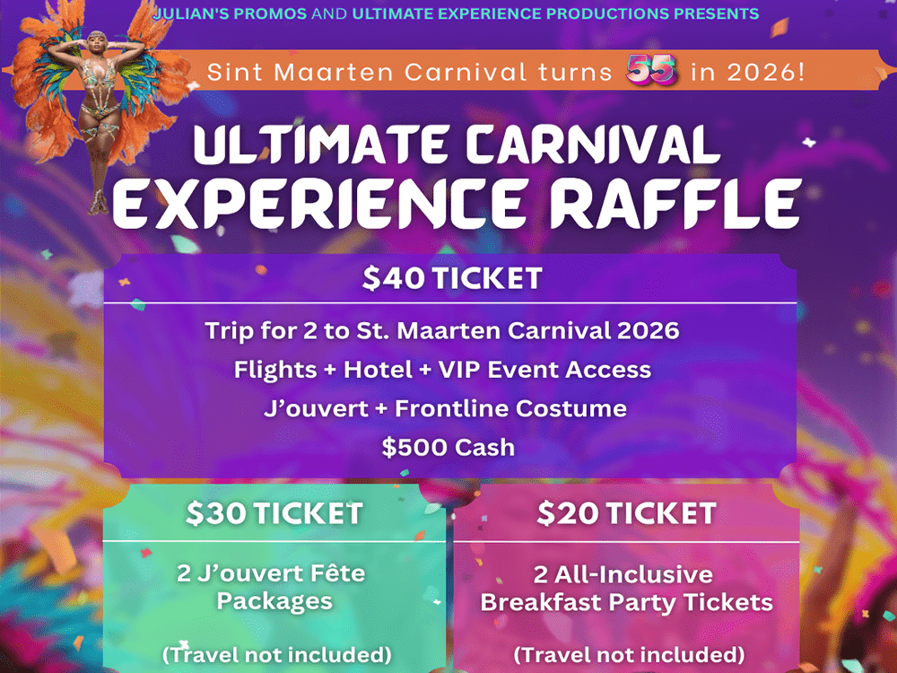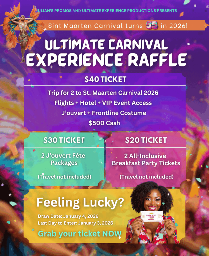 Philipsburg, Sint Maarten – To celebrate the 55th Anniversary of Sint Maarten Carnival 2026, JuliansPromo and Ultimate Experience Productions have launched an exciting online raffle offering multiple chances to win unforgettable Carnival experiences – including an all‑expense‑paid Grand Prize trip for two. Colorful costumes, pulsating music, and tropical vibes await… are you in?
